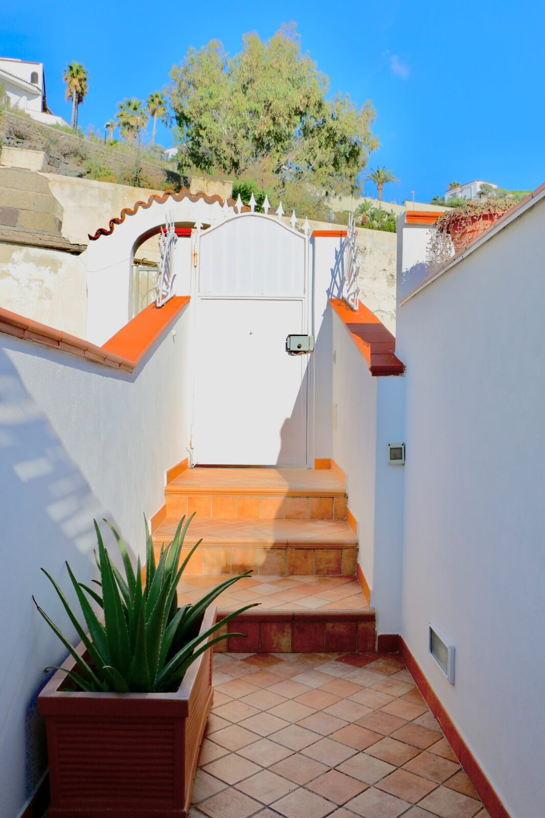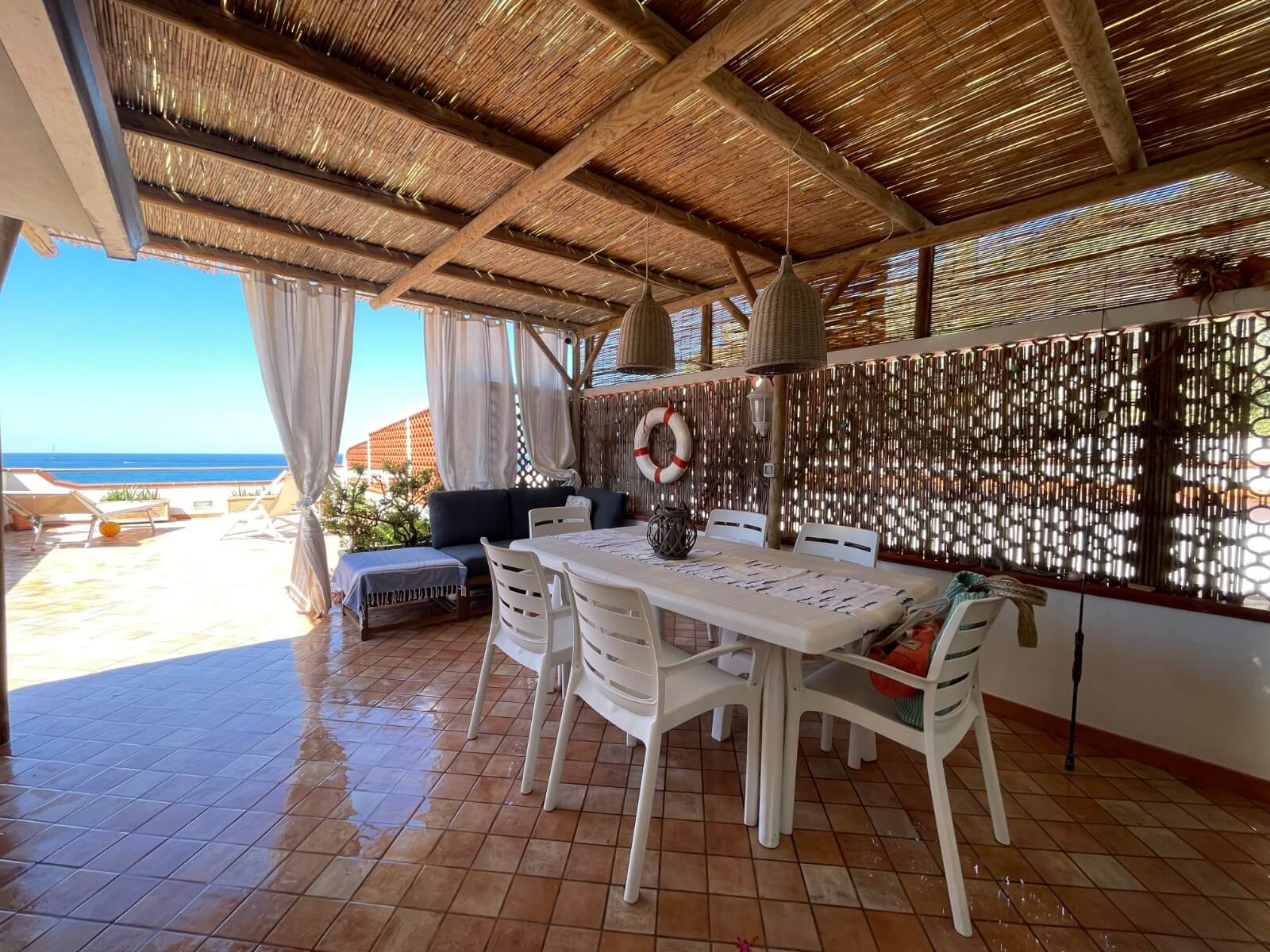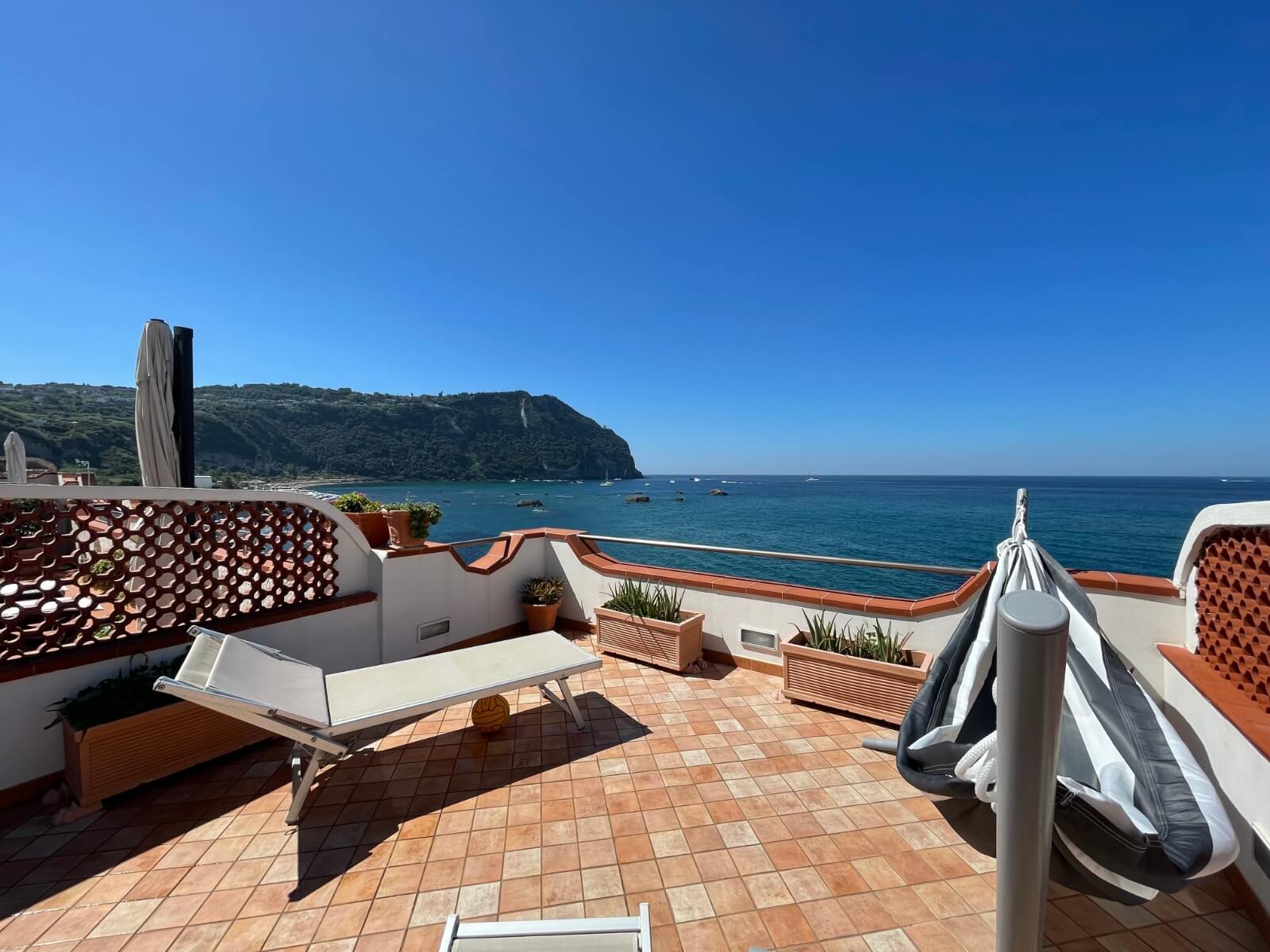 L'appartamento ha un grande terrazzo arredato, di circa 70 mq con tavolo e sedie, divano, amaca e lettino prendisole. Al terrazzo è annessa la cucina, il bagno di servizio con la lavatrice, ed una grande cabina doccia. Si affaccia direttamente sul mare della baia.
